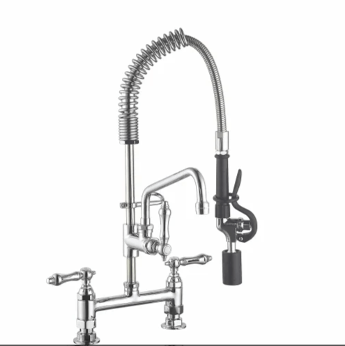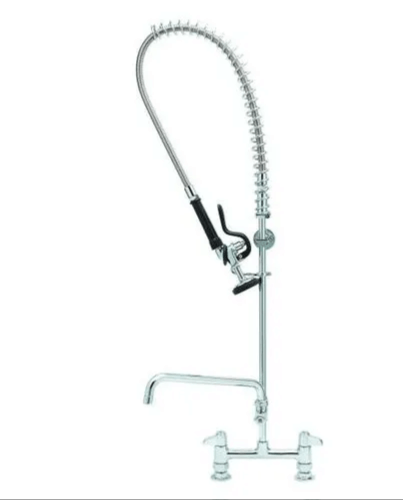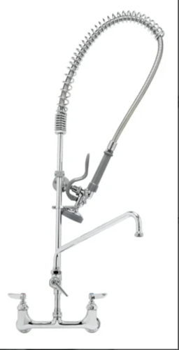8" deck mount mixing faucet with polished chrome plated brass body, add-on faucet with ceramic cartridge and lever handle, 12 1/8" swing nozzle with laminar flow device, 18" riser, 44" flexible stainless steel hose with heat resistant handle, 1.15 GPM spray valve, ceramic cartridges, lever handles, in-line check valves, 1/2" NPT female inlets, 6" adjustable wall bracket, spray valve holder and overhead spring.