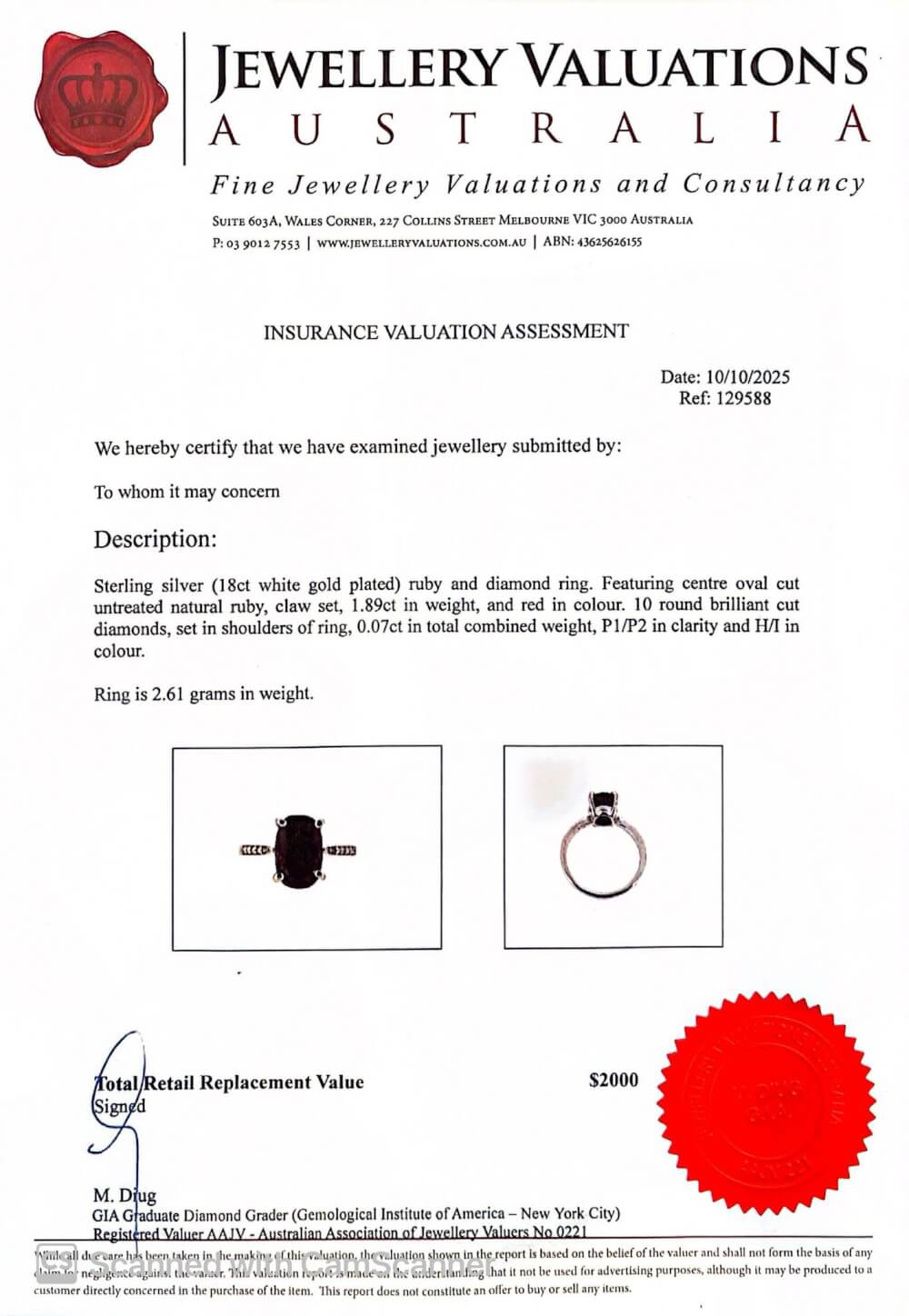 Centre Stone: Untreated natural oval cut ruby, 1.89ct, deep red in colour, claw set.