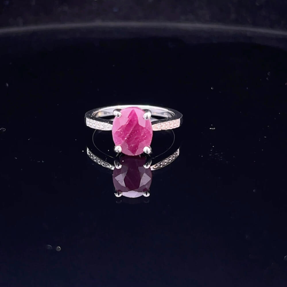 Presenting a timeless piece of elegance: a sterling silver (18ct white gold plated) ruby and diamond ring, meticulously crafted to perfection.