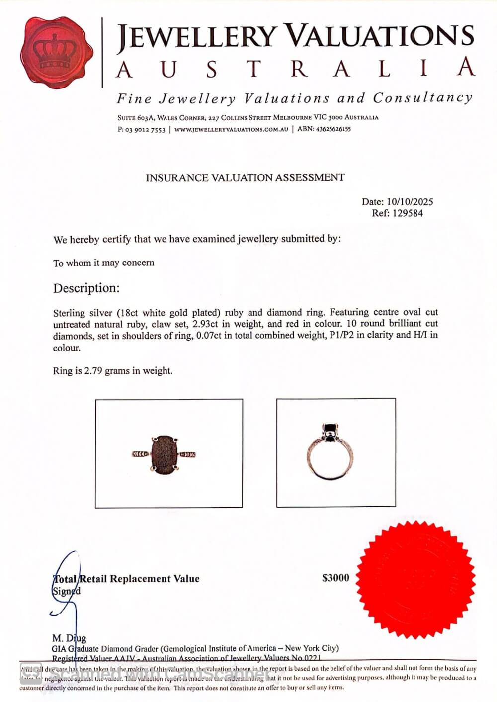 Centre Stone: Untreated natural oval cut ruby, 2.93ct, deep red in colour, claw set.