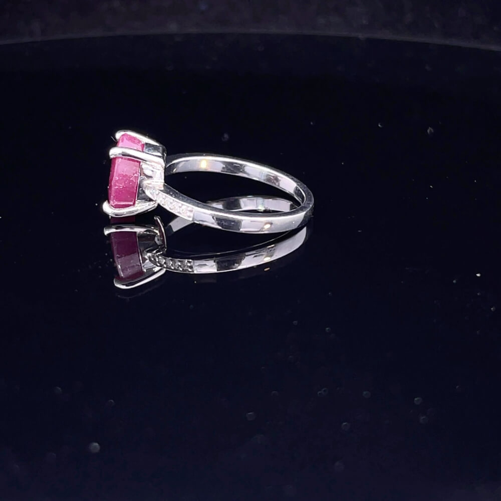 Presenting a timeless piece of elegance: a sterling silver (18ct white gold plated) ruby and diamond ring, meticulously crafted to perfection.