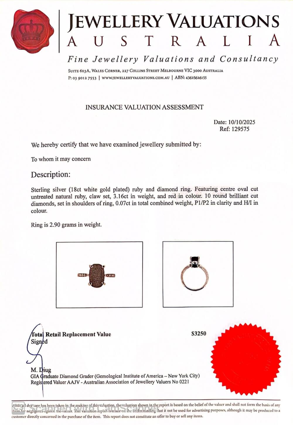 Centre Stone: Untreated natural oval cut ruby, 3.16ct, deep red in colour, claw set.