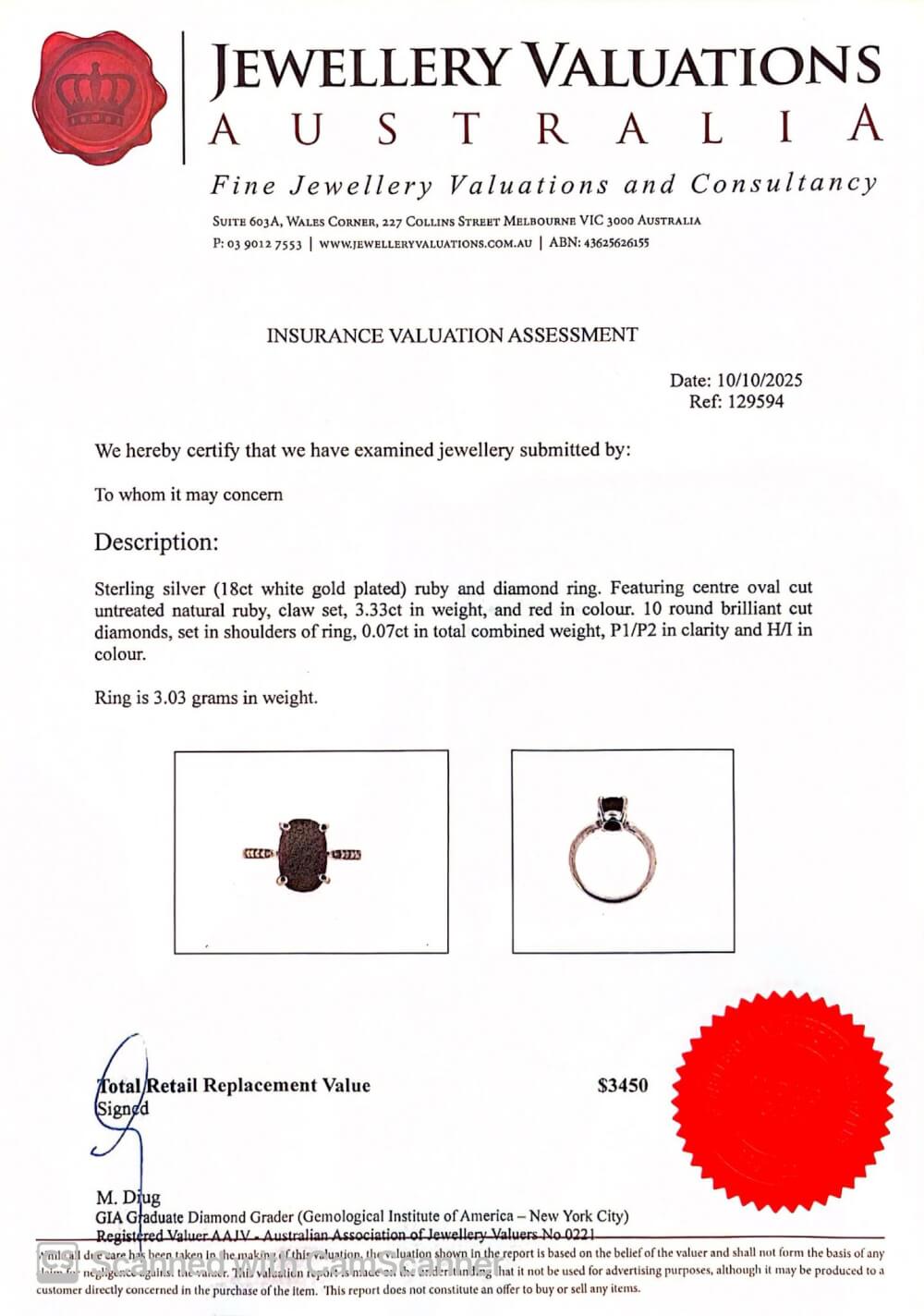 Centre Stone: Untreated natural oval cut ruby, 3.33ct, deep red in colour, claw set.