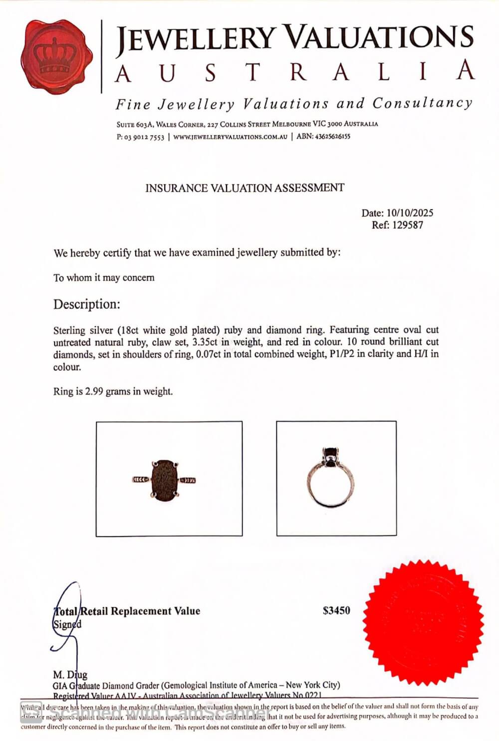 Centre Stone: Untreated natural oval cut ruby, 3.35ct, deep red in colour, claw set.