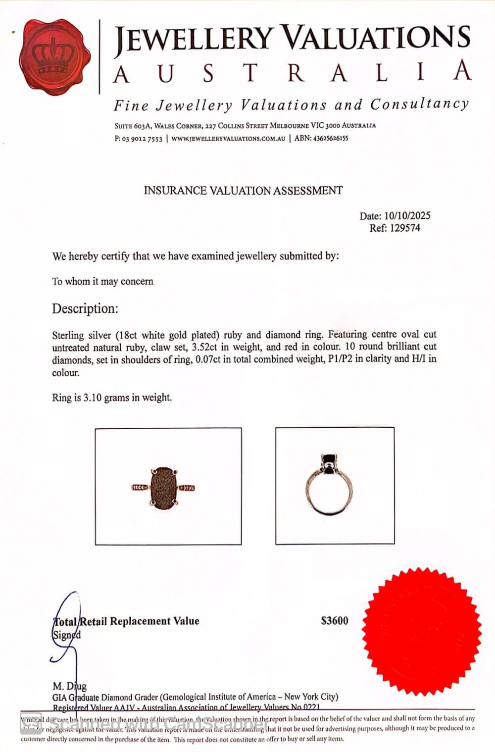Centre Stone: Untreated natural oval cut ruby, 3.52ct, deep red in colour, claw set.