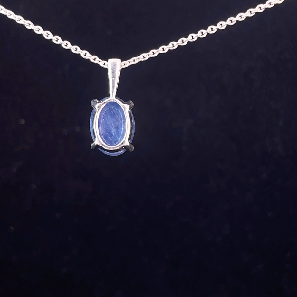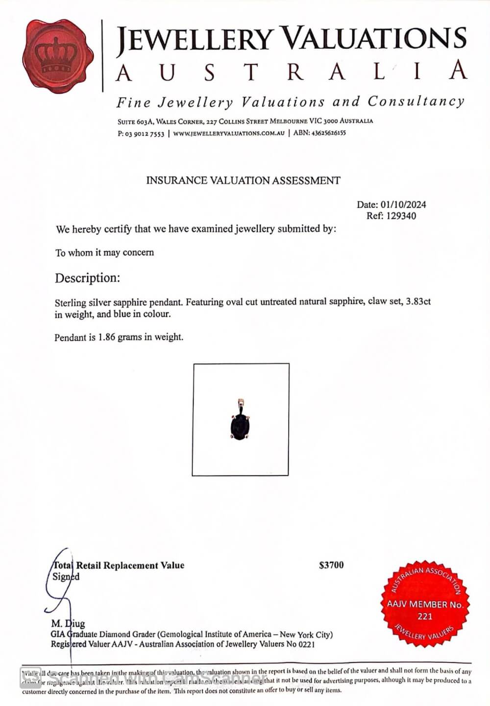 Elegant sterling silver sapphire pendant only, featuring a 3.83ct oval-cut untreated natural blue sapphire, claw set to enhance its depth of colour and brilliance.