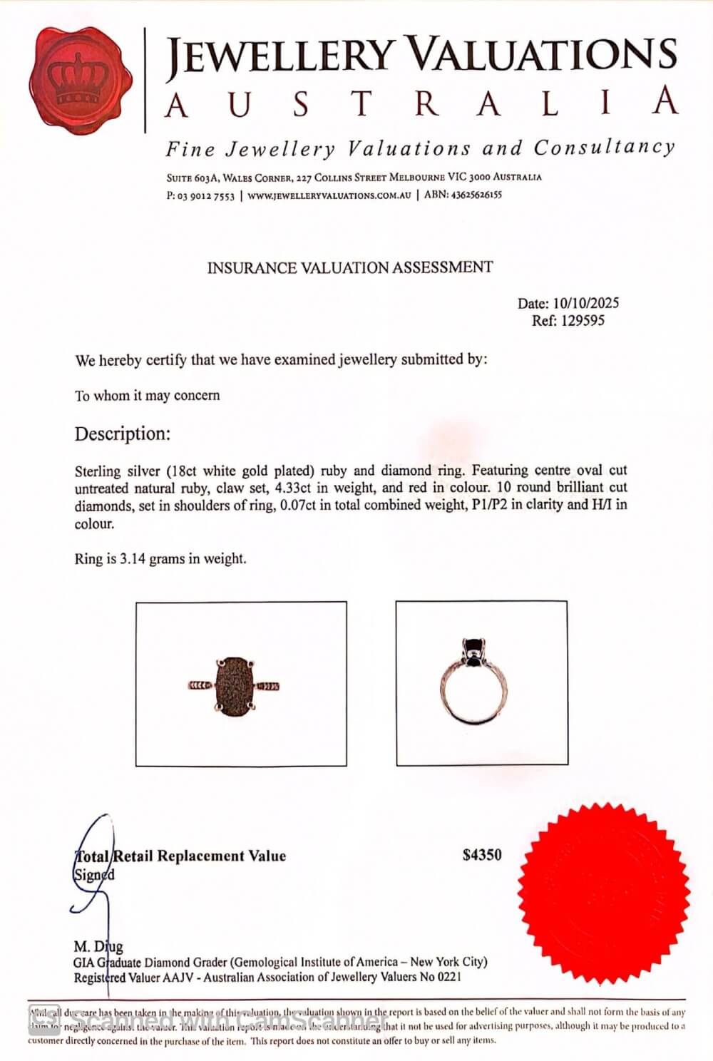 Presenting a timeless piece of elegance: a sterling silver (18ct white gold plated) ruby and diamond ring, meticulously crafted to perfection.