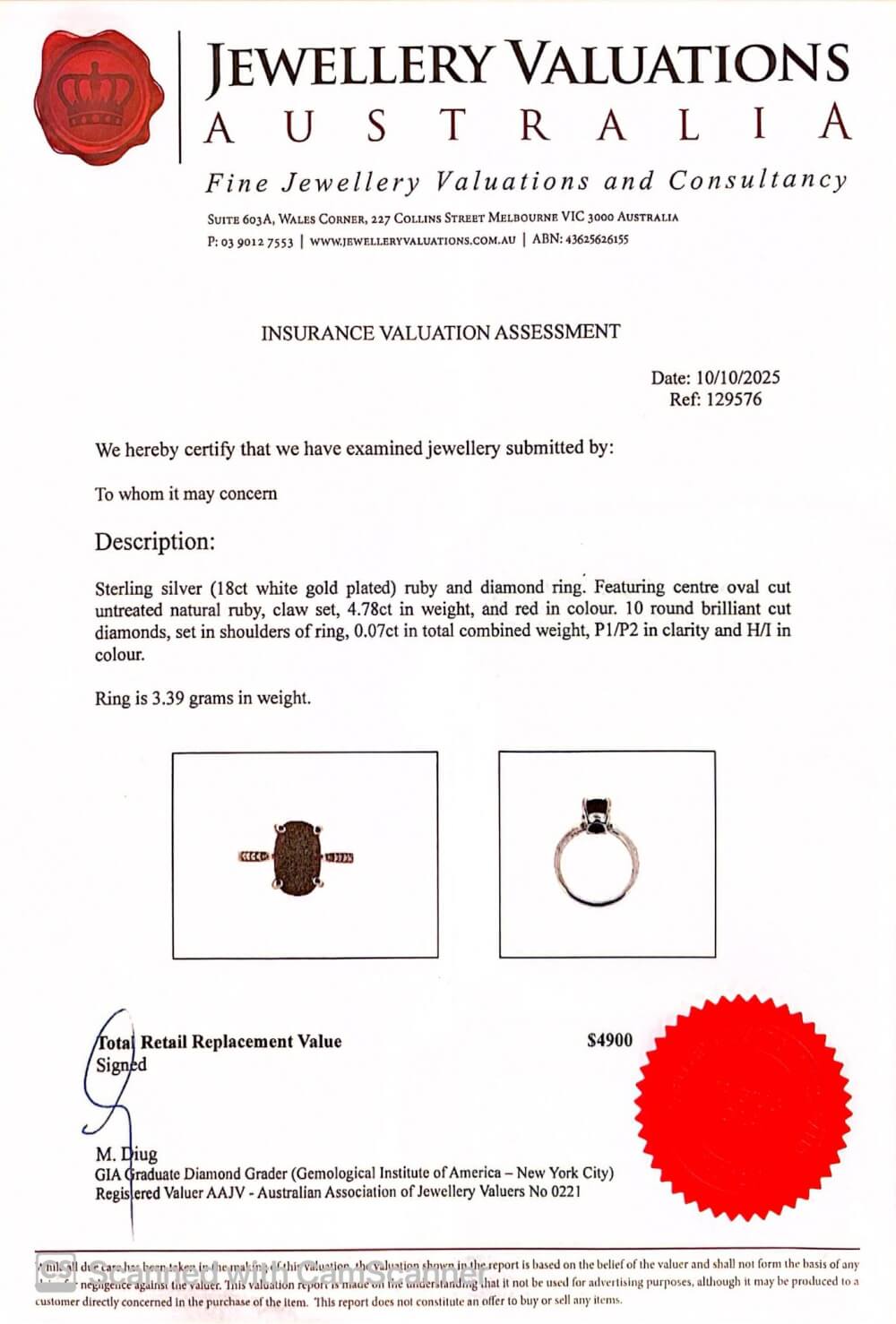 Centre Stone: Untreated natural oval cut ruby, 4.78ct, deep red in colour, claw set.