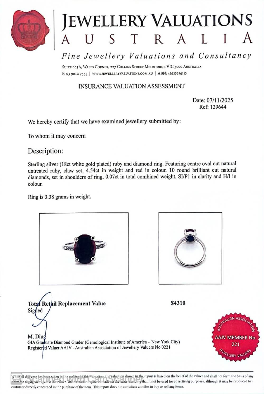 • Centre Stone: Natural untreated oval-cut Ruby – 4.82ct in weight and red colour (as per the independent valuation)