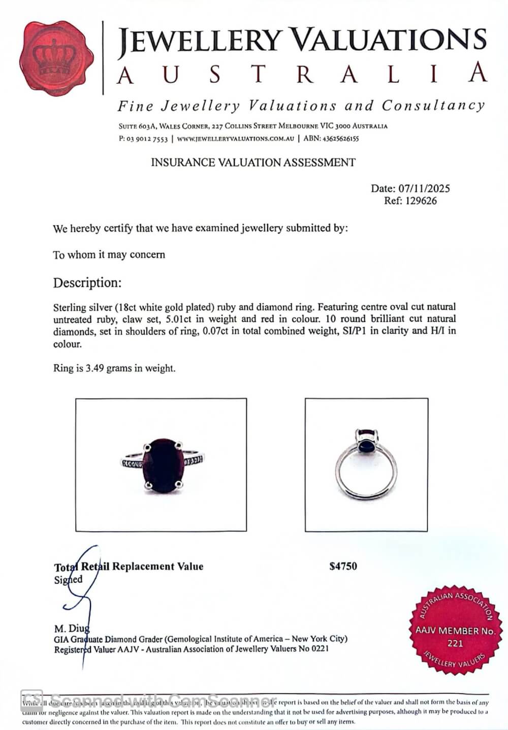 • Centre Stone: Natural untreated oval-cut Ruby – 5.01ct in weight and red colour (as per the independent valuation)