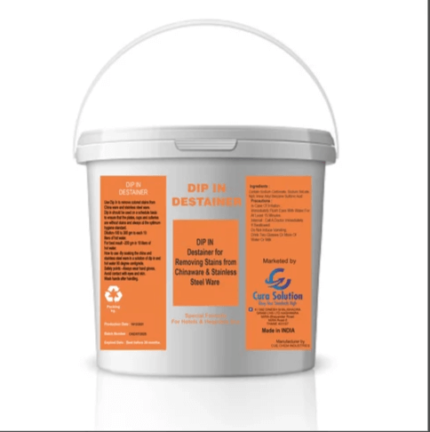 Use Dip In to remove colored stains from China ware and stainless steel ware. Dip in should be used on a schedule basis to ensure that the plates, cups and cutleries are without stains and always at the optimum hygiene standard.