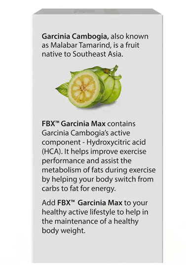 FBX Garcinia Max contains Garcinia Cambogia's active component - Hydroxycitric acid (HCA). It helps improve exercise performance and assist the metabolism of fats during exercise by helping your body switch from carbs to fat for energy.