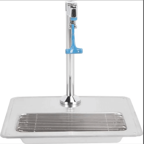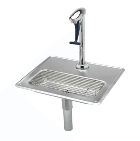 Deck mount water station with polished chrome plated brass pedestal type glass filler, adjustable flow outlet, push back actuation arm, pedestal with adjustable deck flange, 18 gauge stainless steel drip pan with drop-in grid and 1 1/4" drain.
