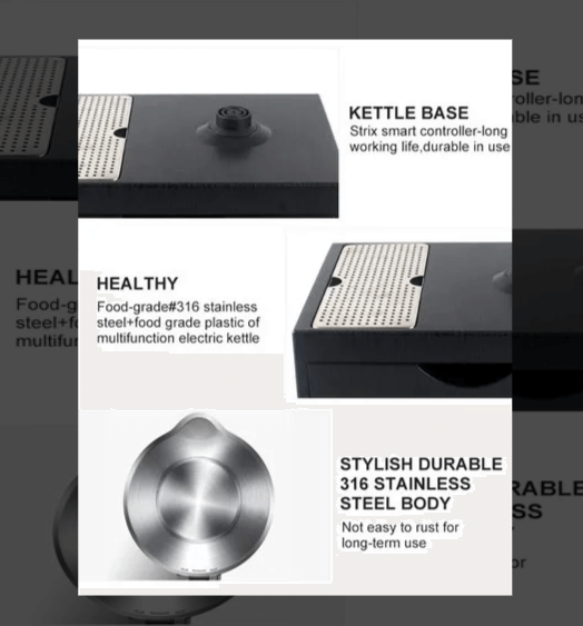 •Kettle Material 304 SS+ABS(Food Grade) •Tray Material ABS •Capacity 1.2 Ltr •Power Rate 1350-1600W •Max 3 Differentiator Great Features i)Automatic Cutoff ii)360 Degree Swivel Base iii)Single Touch lid locking