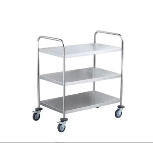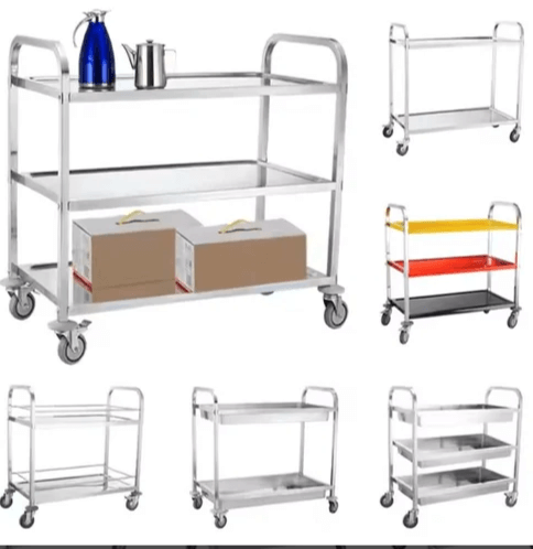 The serving trolley is also an excellent help when clearing away dirty dishes in the kitchen. This professional serving trolley is fitted with three stainless steel shelves.